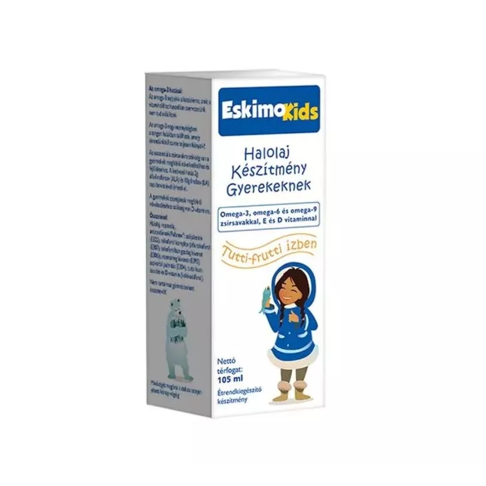 Az Eskimo-Kids napi adagja gyermekeknek 1 teáskanál (5 ml), melyben 5 mikrogramm D vitamin van, amely 200 NE-nek felel meg (NE=Nemzetközi Egység). Egy üveg (105ml) tartalma kb. 40 napig elegendő. Omega-3 tartalom: 1 üveg halolaj = kb. 3 kg tengeri hal. Az Eskimo Kids tisztított, biztonságos halolaj, hatékonyságát és pozitív hatásait 17 nemzetközi klinikai tanulmány bizonyítja. Egy teáskanál Eskimo Kids (5 ml / napi mennyiség) esetén: Energia 170 kJ (40 kcal) Fehérje 0,5 mg Szénhidrát 2 g Zsír 4,60 g Ebből Telített zsírsav 0,60 g Egyszeresen telítetlen zsírsav 2,00 g Többszörösen telítetlen zsírsav 1,5 g Ebből Omega-6 zsírsav 500 mg - ebből linolsav 500 mg Omega-3 zsírsav 600 mg - ebből alfa-linolénsav 230 mg - EPA 460 mg - DHA 280mg Omega-9 zsírsav (olajsav) 1400 mg E-vitamin 6,7 mg D-vitamin 5 mcg. Összetevők: természetes halolaj: omega-3 EPA és DHA, omega-6, természetes repce olaj, természetes D és E vitamin, természetes aromák, antioxidánsok: lecitin, aszkorbil-palmitát (A C-vitamin egyik zsírban oldódó változata, mely a legtöbb gyümölcsben és zöldségfélében előfordul).
